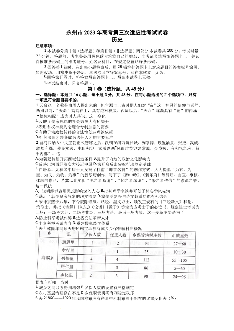 高三历史+答案--湖南省永州市2023届高考第三次适应性考试