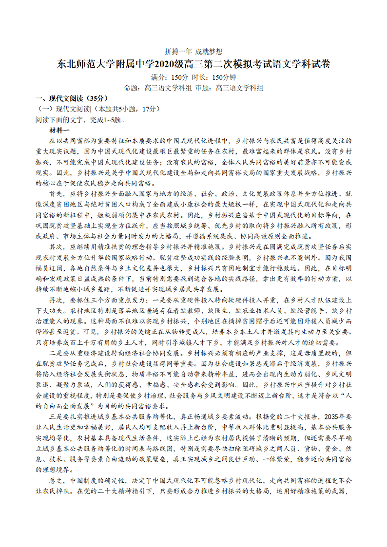 高三语文+答案--吉林省长春市东北师范大学附属中学2022-2023学年高三下学期第二次模拟考试