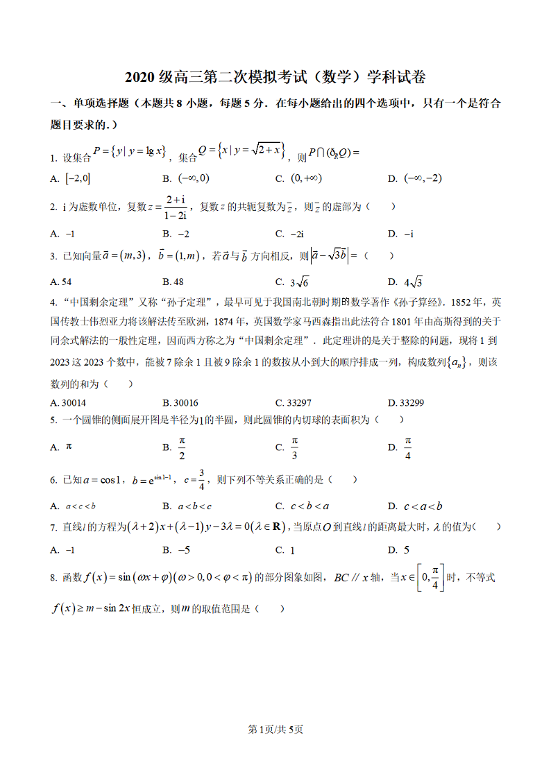 高三数学--吉林省长春市东北师范大学附属中学2022-2023学年高三下学期第二次模拟考试