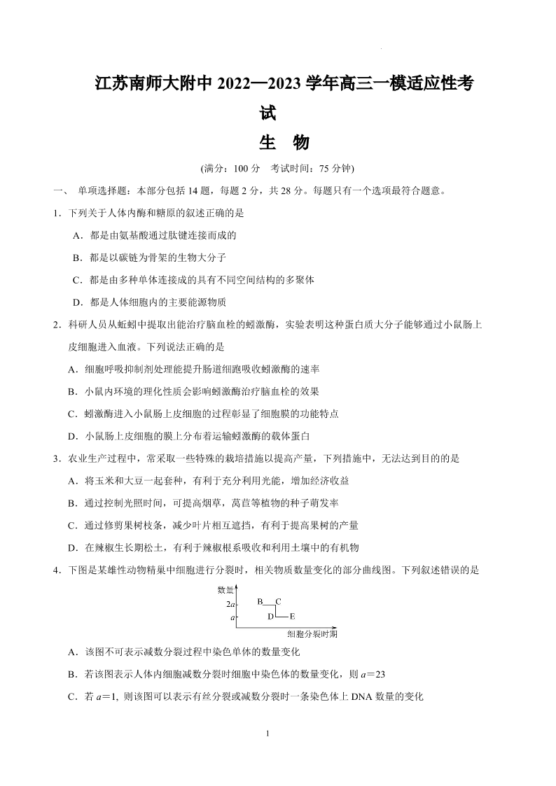 高三生物+答案--江苏省南京师范大学附属中学2023高三一模适应性考试