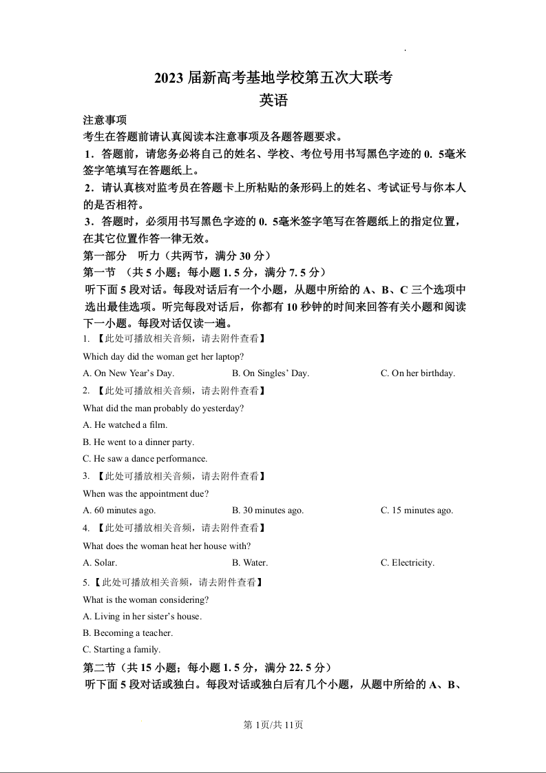 高三英语(原卷版)--江苏省新高考基地学校2022-2023学年高三下学期第五次大联考