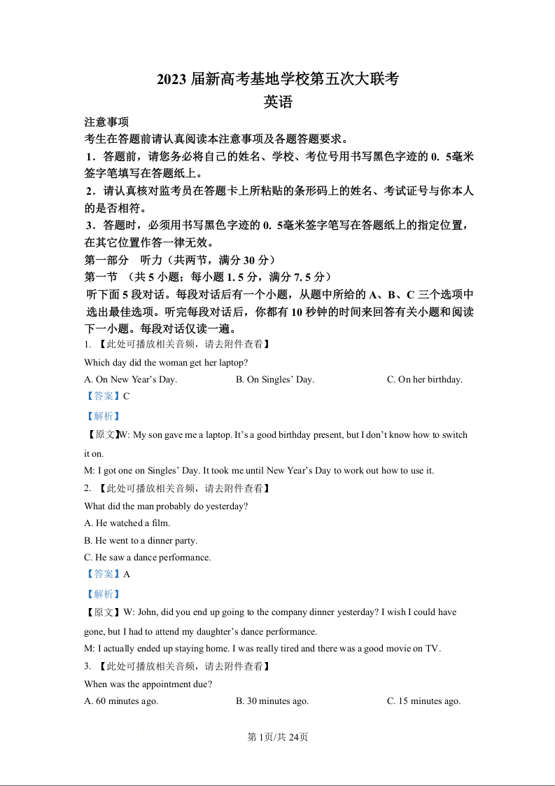 高三英语(精品解析版)--江苏省新高考基地学校2022-2023学年高三下学期第五次大联考