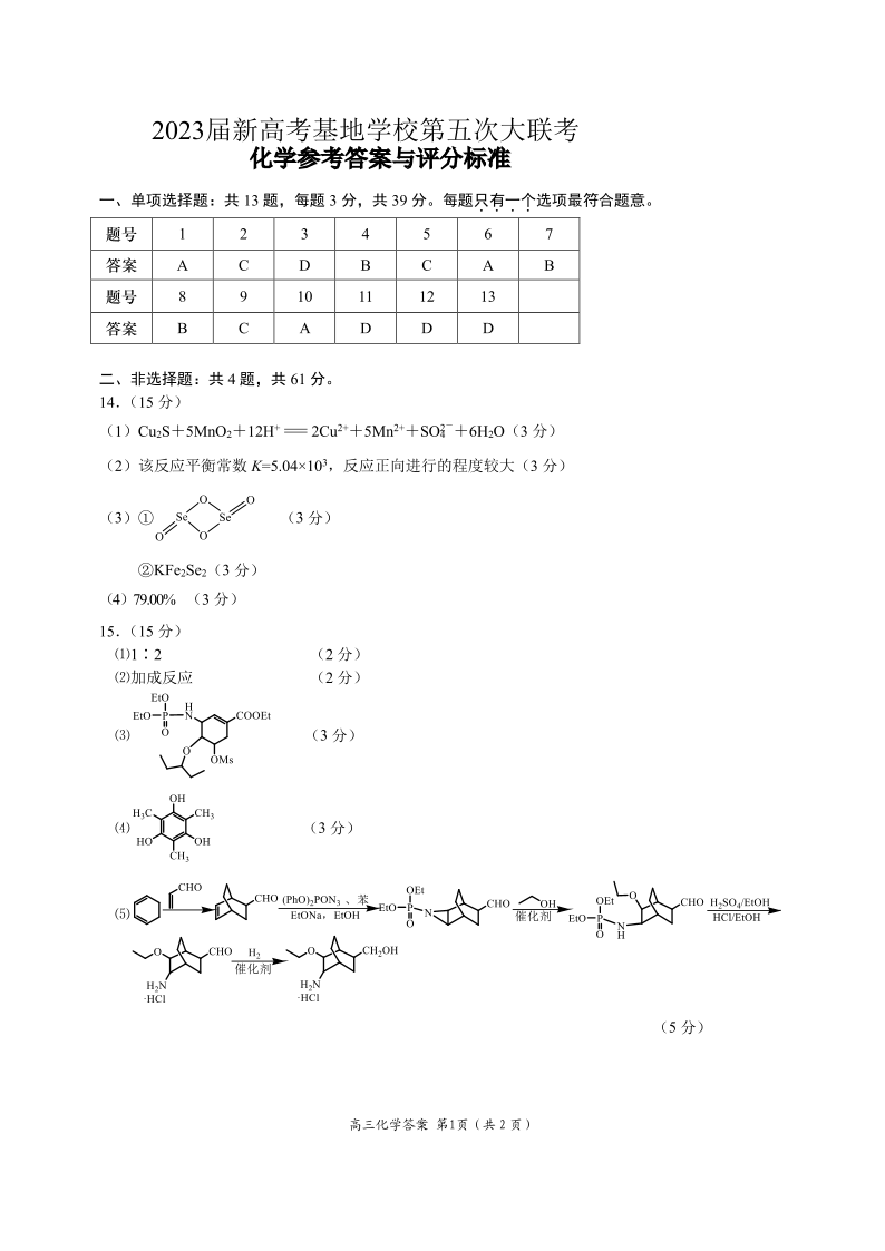 高三化学答案--江苏省新高考基地学校2022-2023学年高三下学期第五次大联考