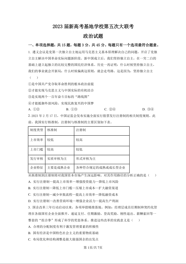高三政治(原卷版)--江苏省新高考基地学校2022-2023学年高三下学期第五次大联考