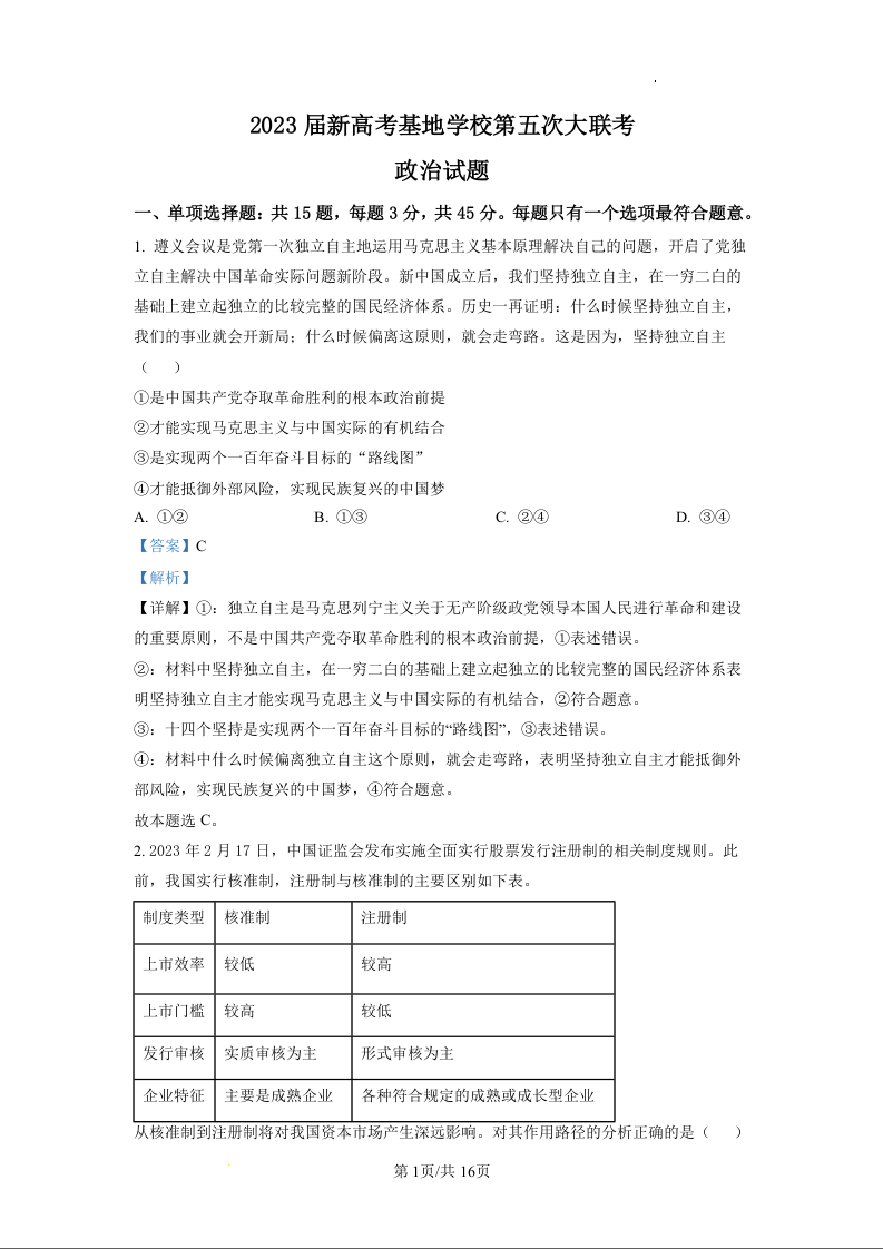 高三政治(精品解析版)--江苏省新高考基地学校2022-2023学年高三下学期第五次大联考