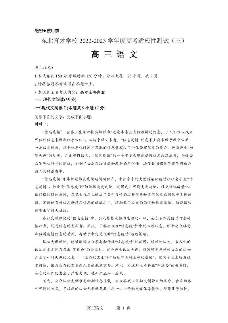 高三语文--辽宁省沈阳市东北育才学校2023届高三 三模