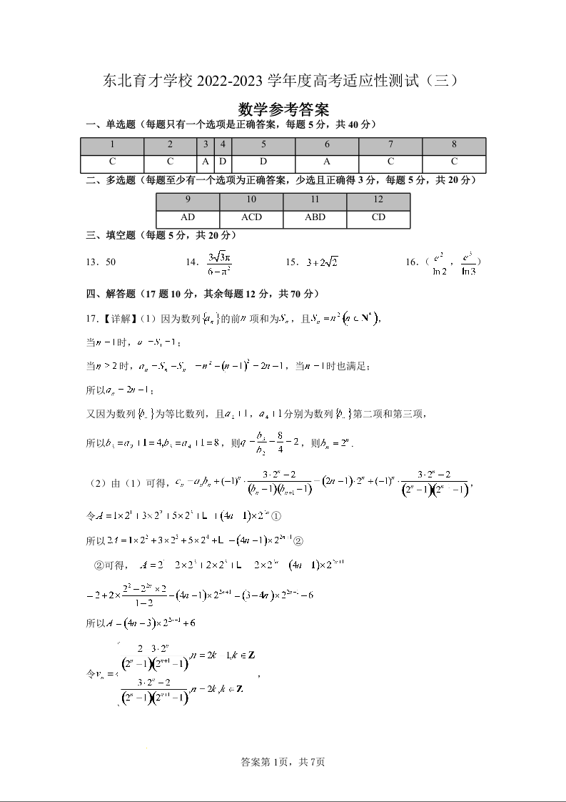 高三数学答案--辽宁省沈阳市东北育才学校2023届高三 三模