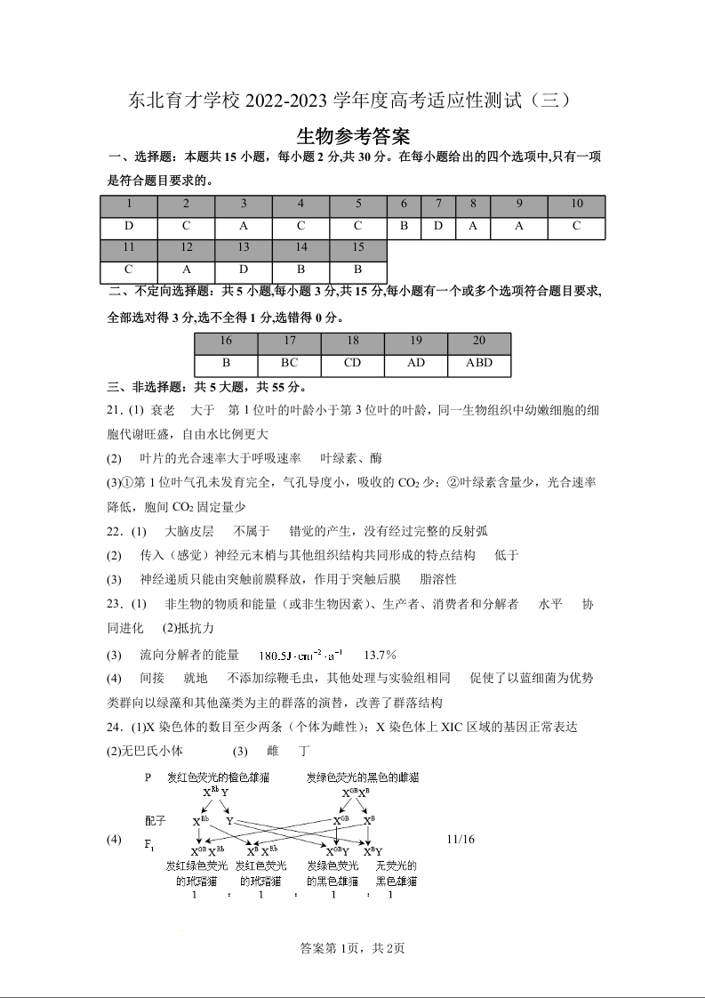 高三生物答案--辽宁省沈阳市东北育才学校2023届高三 三模