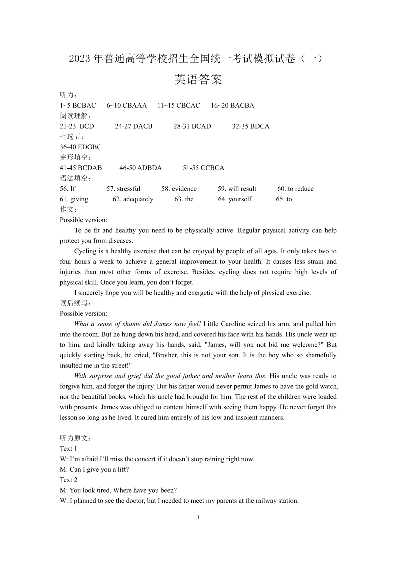 高三英语答案--辽宁省2023普通高等学校招生选择性考试模拟(一)(辽宁省实验一模)