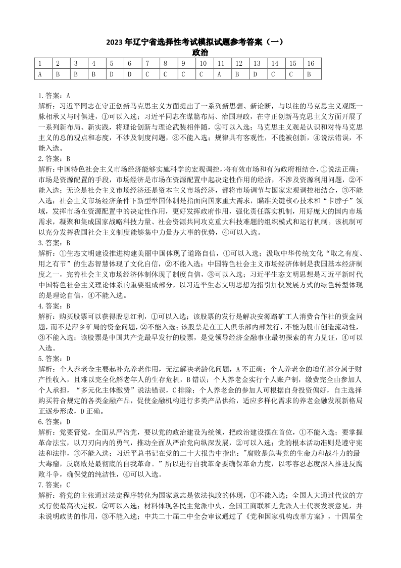 高三政治答案--辽宁省2023普通高等学校招生选择性考试模拟(一)(辽宁省实验一模)