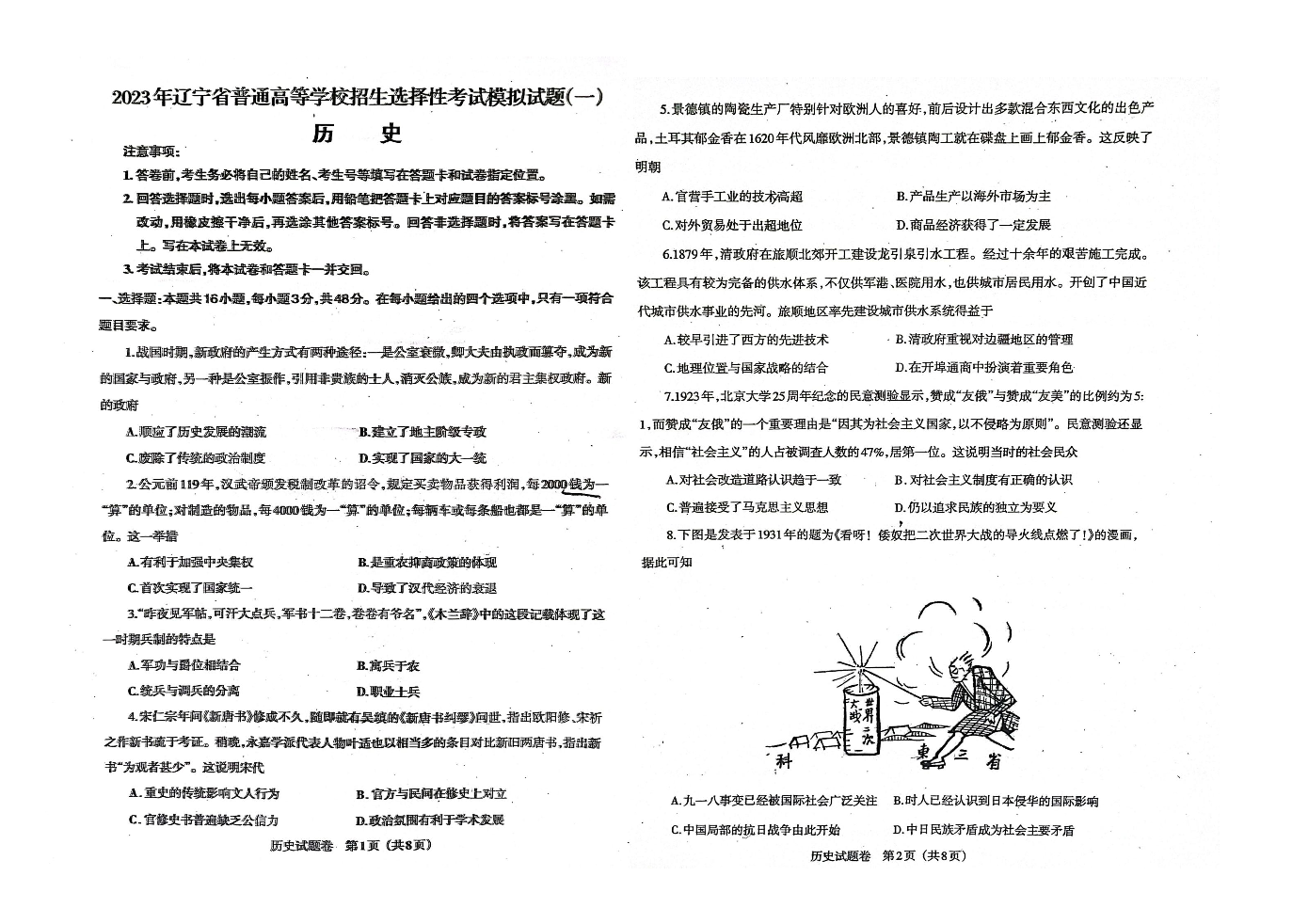 高三历史--辽宁省2023普通高等学校招生选择性考试模拟(一)(辽宁省实验一模)