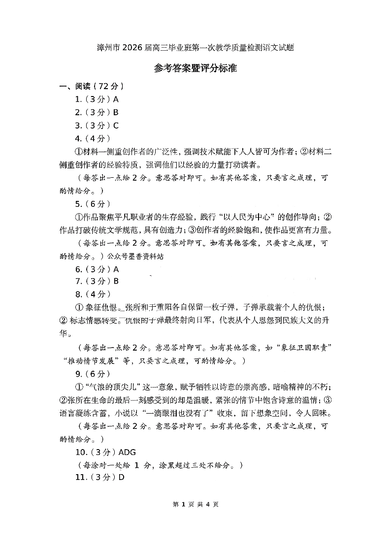 高三语文答案--福建省漳州市2026届高中毕业班第一次质量检测
