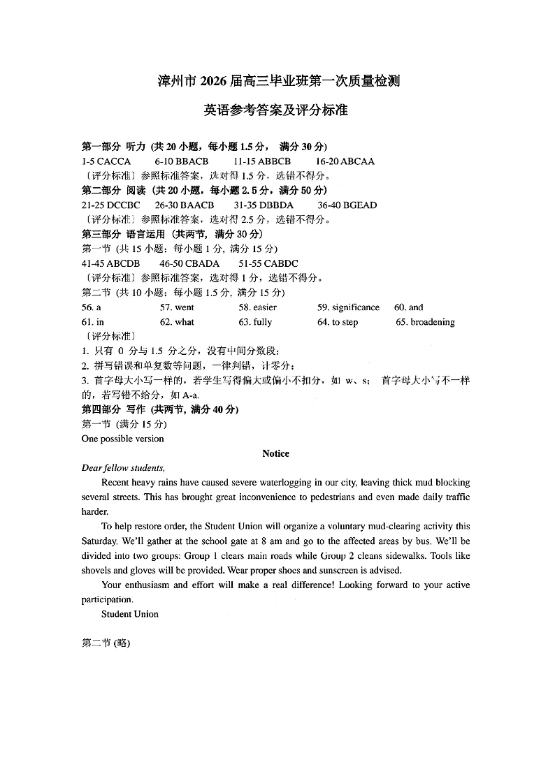 高三英语答案--福建省漳州市2026届高中毕业班第一次质量检测