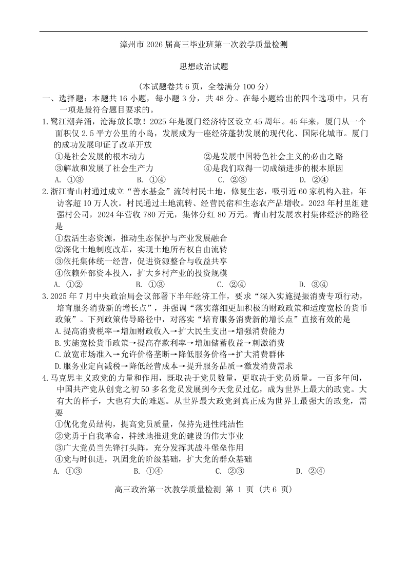 高三政治--福建省漳州市2026届高中毕业班第一次质量检测