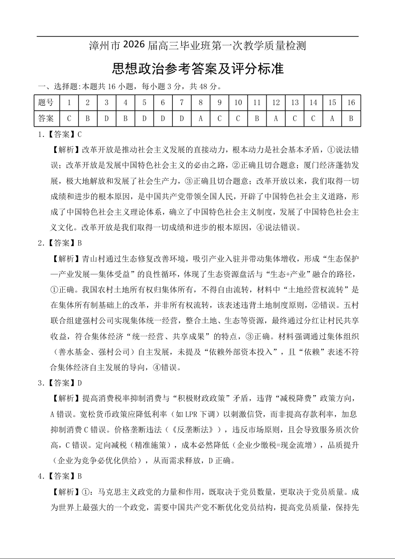高三政治答案--福建省漳州市2026届高中毕业班第一次质量检测