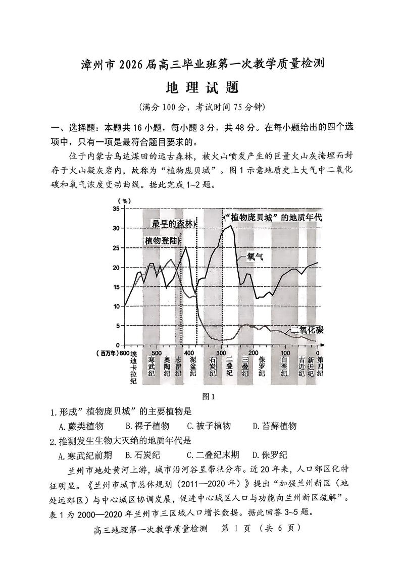 高三地理--福建省漳州市2026届高中毕业班第一次质量检测