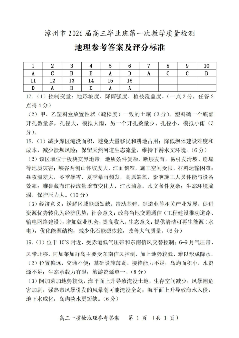 高三地理答案--福建省漳州市2026届高中毕业班第一次质量检测