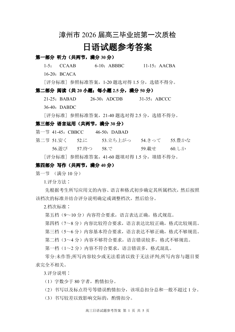 高三日语答案--福建省漳州市2026届高中毕业班第一次质量检测