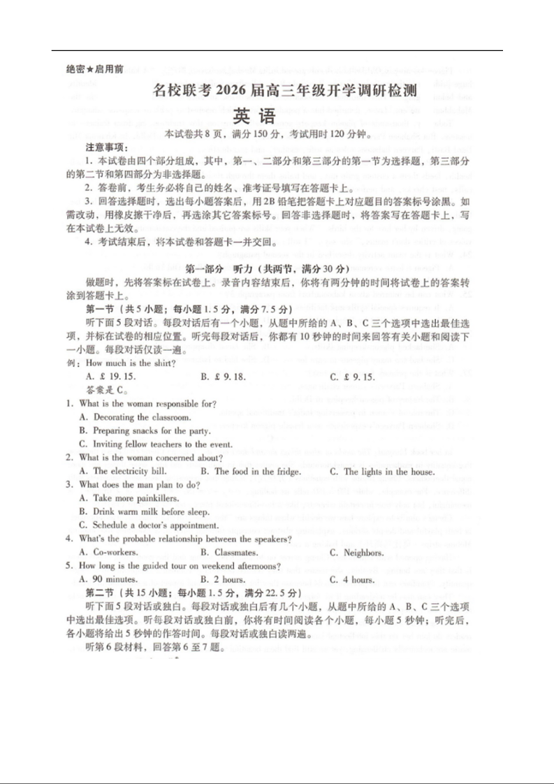 高三英语--河北省琢名小渔名校联考2026届高三上学期开学调研检测