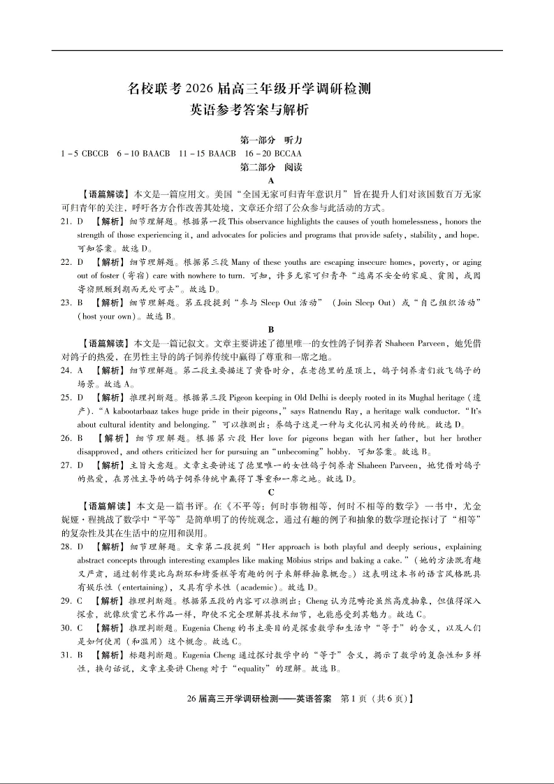 高三英语答案--河北省琢名小渔名校联考2026届高三上学期开学调研检测