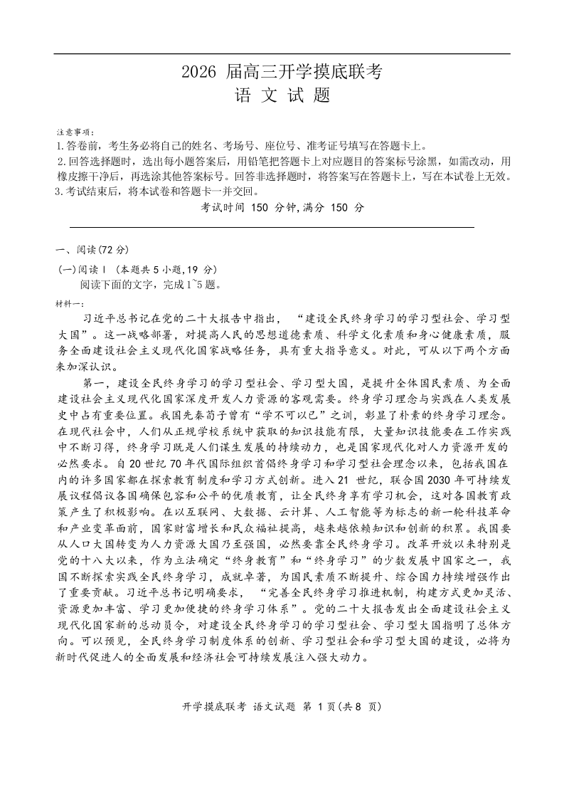 高三语文+答案--百师联盟2026届高三上学期9月开学摸底联考