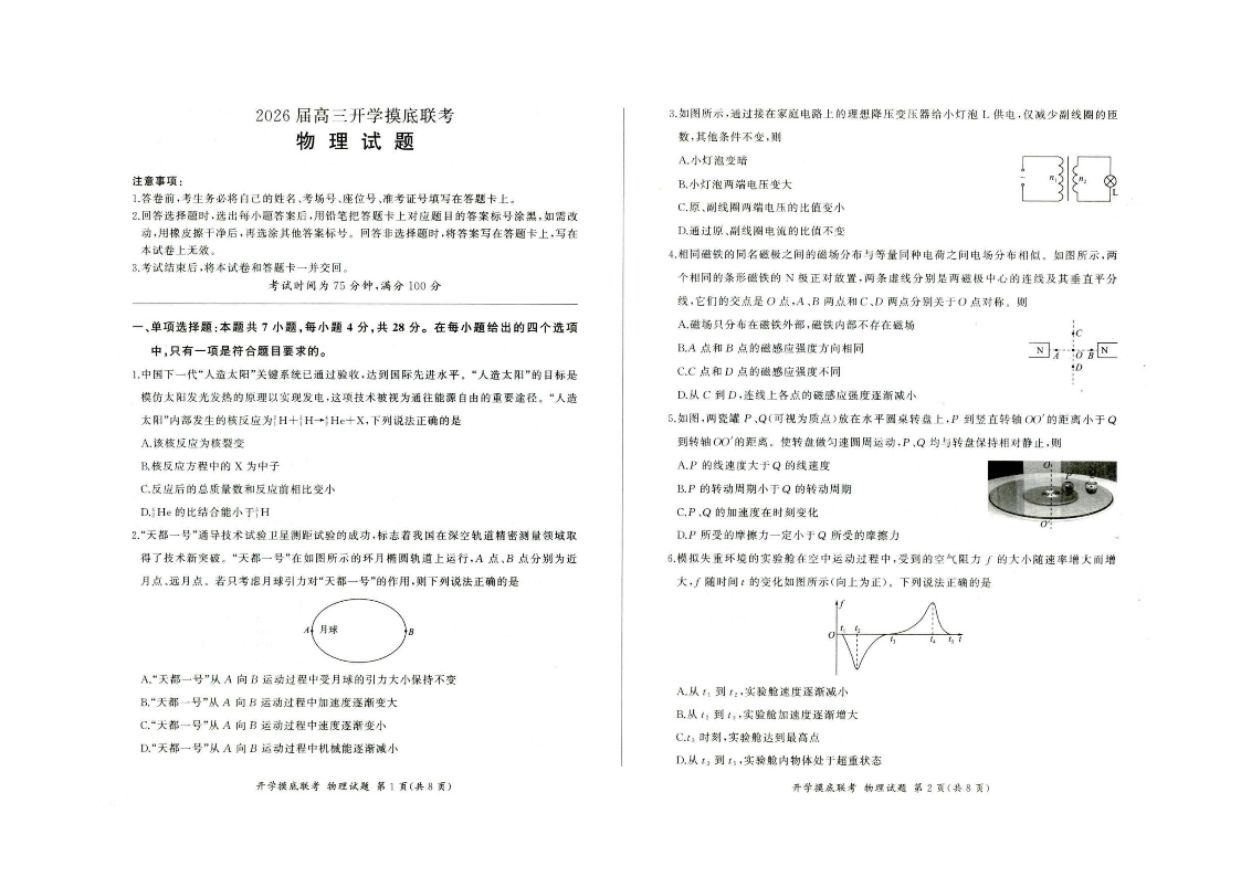 高三物理+答案--百师联盟2026届高三上学期9月开学摸底联考