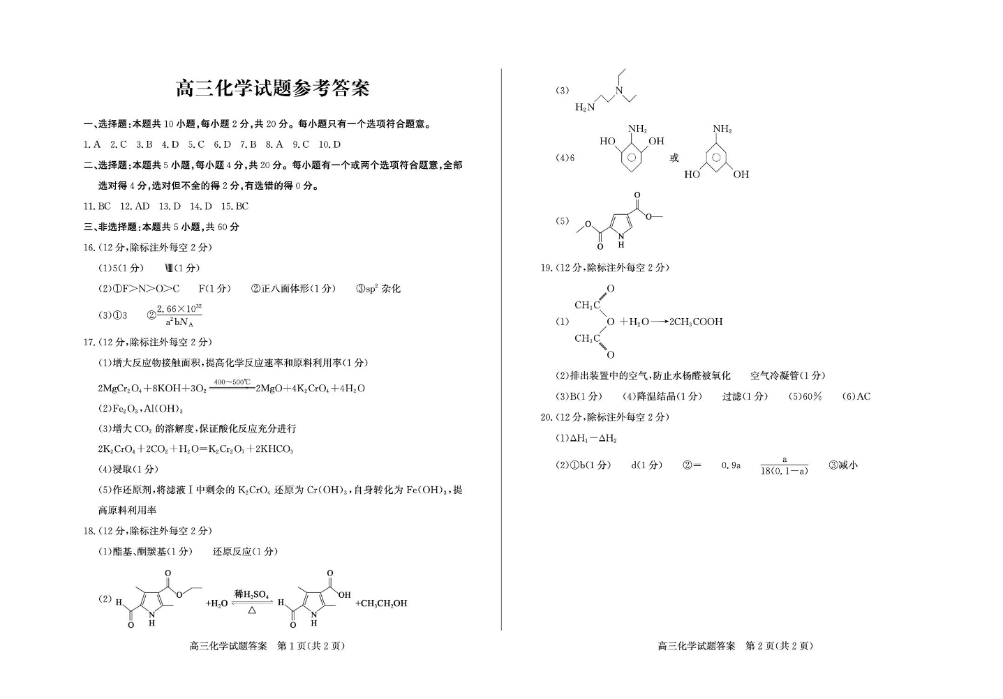 高三化学答案--山东省德州市2026届高三上学期开学考试
