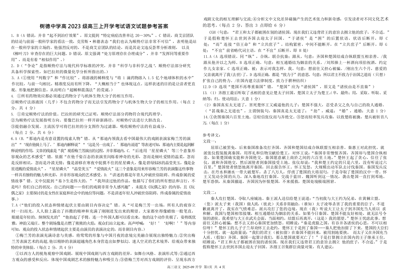 高三语文答案--四川省成都市树德中学高2023级高三上开学考试