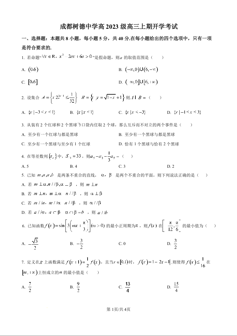 高三数学--四川省成都市树德中学高2023级高三上开学考试