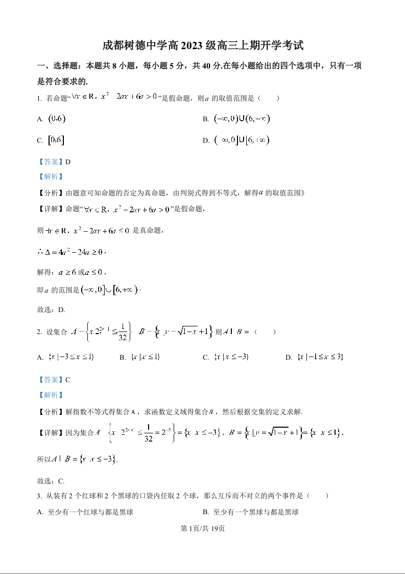 高三数学答案--四川省成都市树德中学高2023级高三上开学考试