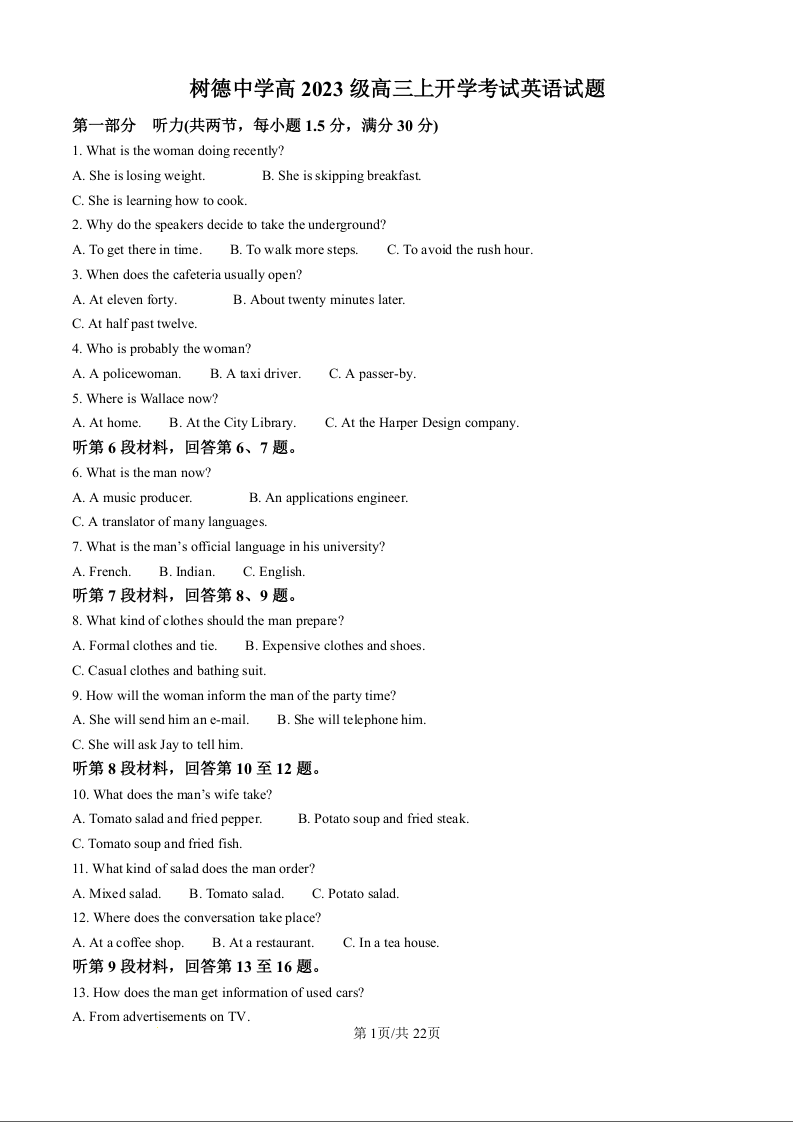 高三英语答案--四川省成都市树德中学高2023级高三上开学考试