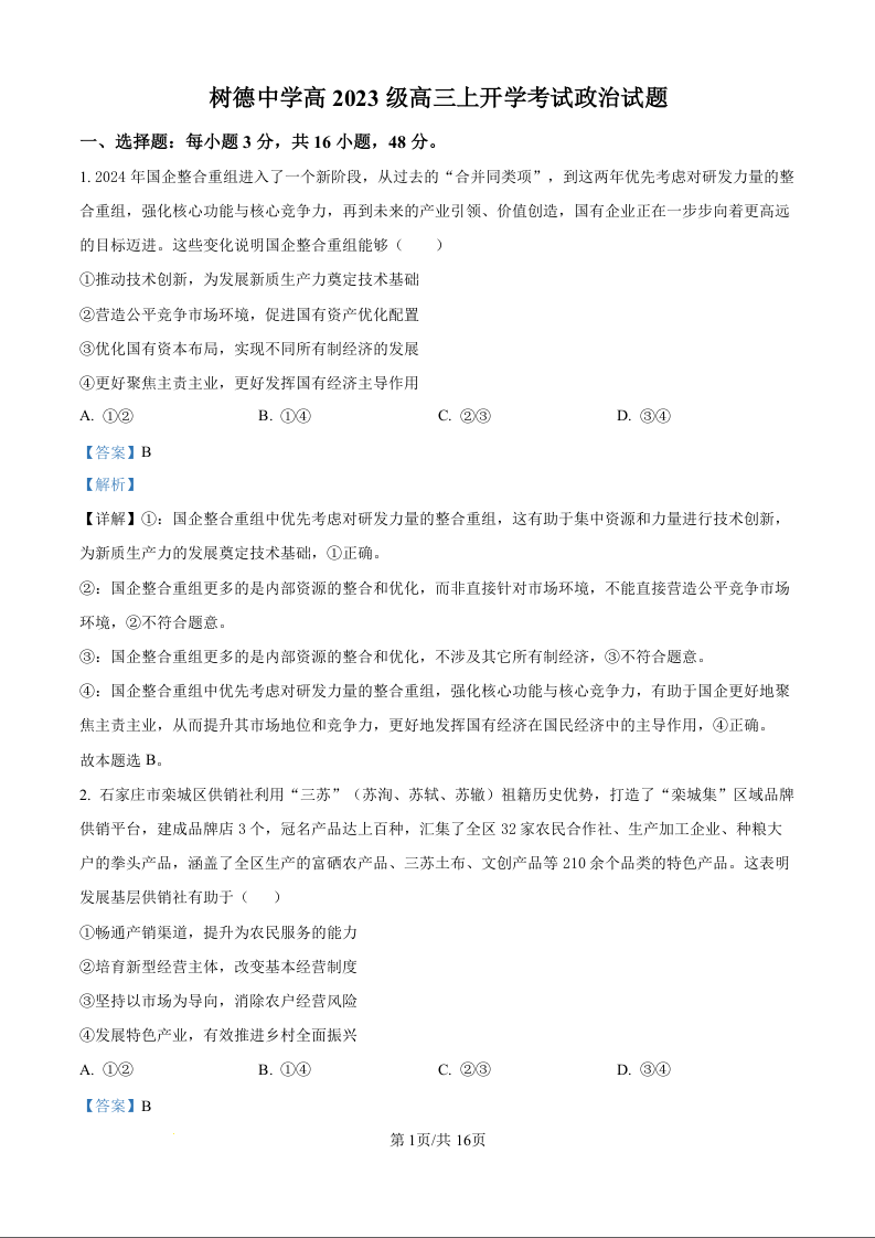 高三政治答案--四川省成都市树德中学高2023级高三上开学考试