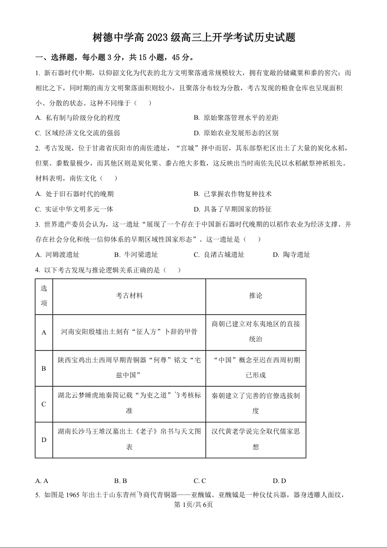高三历史--四川省成都市树德中学高2023级高三上开学考试