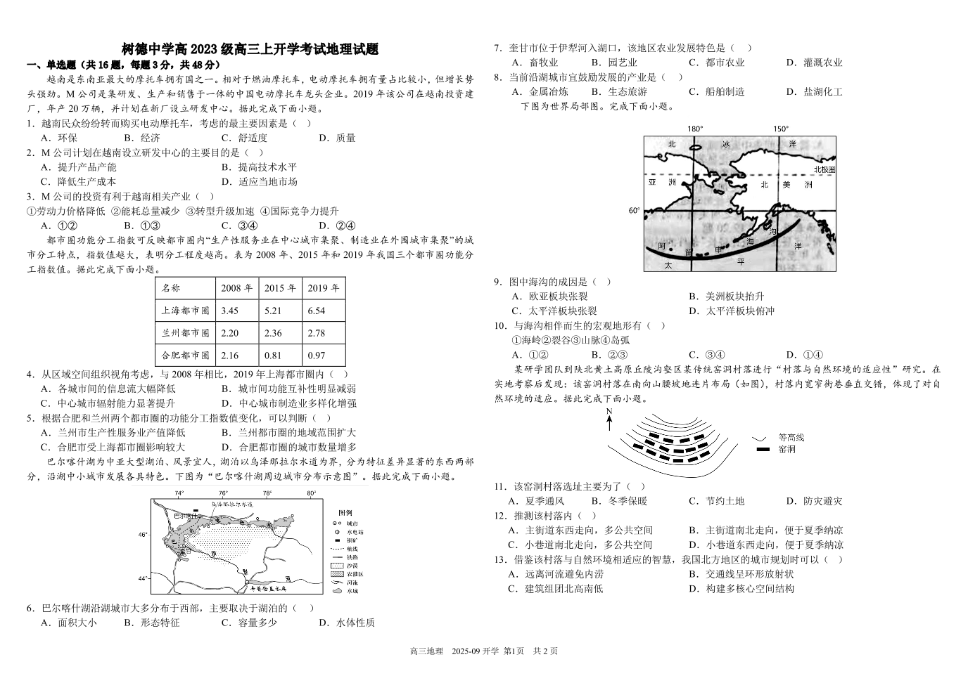 高三地理--四川省成都市树德中学高2023级高三上开学考试