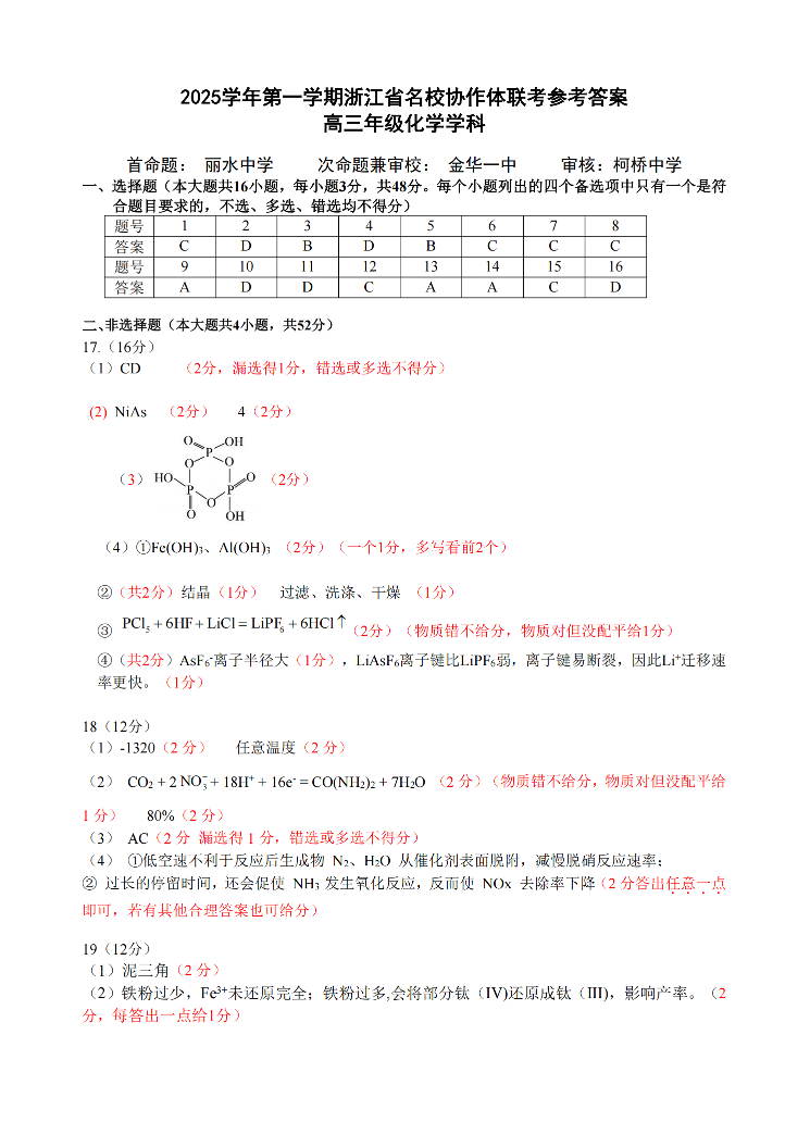 高三化学答案--浙江省名校协作体(G12)2026届高三9月返校联考