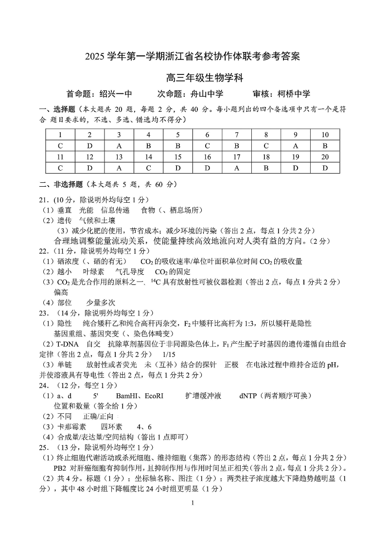 高三生物答案--浙江省名校协作体(G12)2026届高三9月返校联考