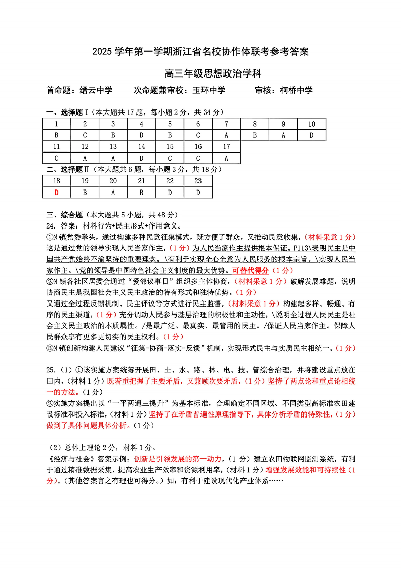 高三政治答案--浙江省名校协作体(G12)2026届高三9月返校联考