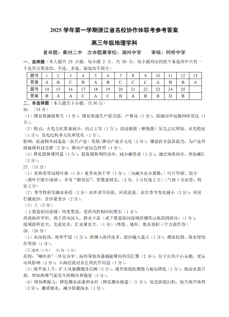 高三地理答案--浙江省名校协作体(G12)2026届高三9月返校联考