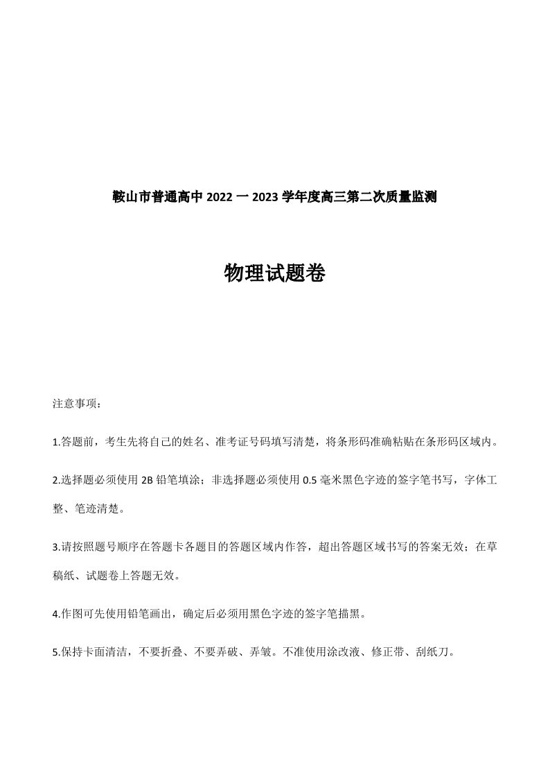 高三物理--辽宁省鞍山市普通高中高三第二次质量监测