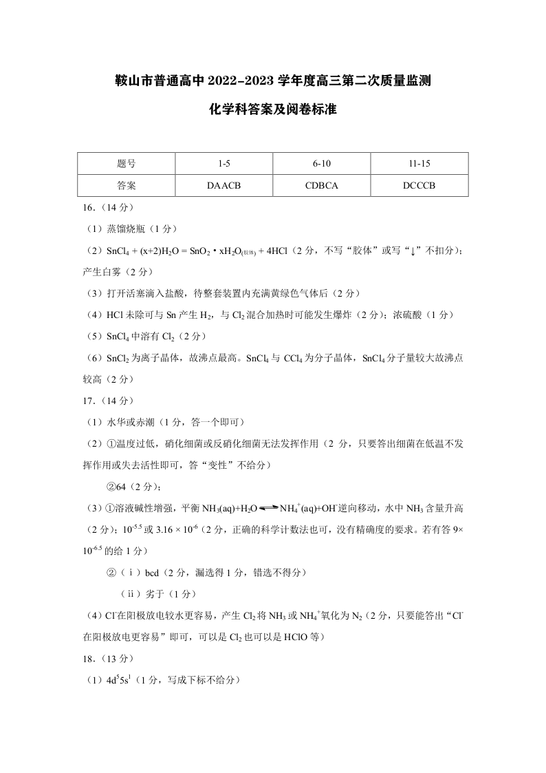 高三化学答案--辽宁省鞍山市普通高中高三第二次质量监测