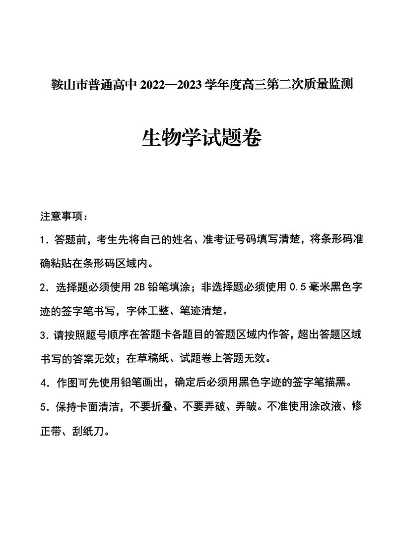 高三生物--辽宁省鞍山市普通高中高三第二次质量监测