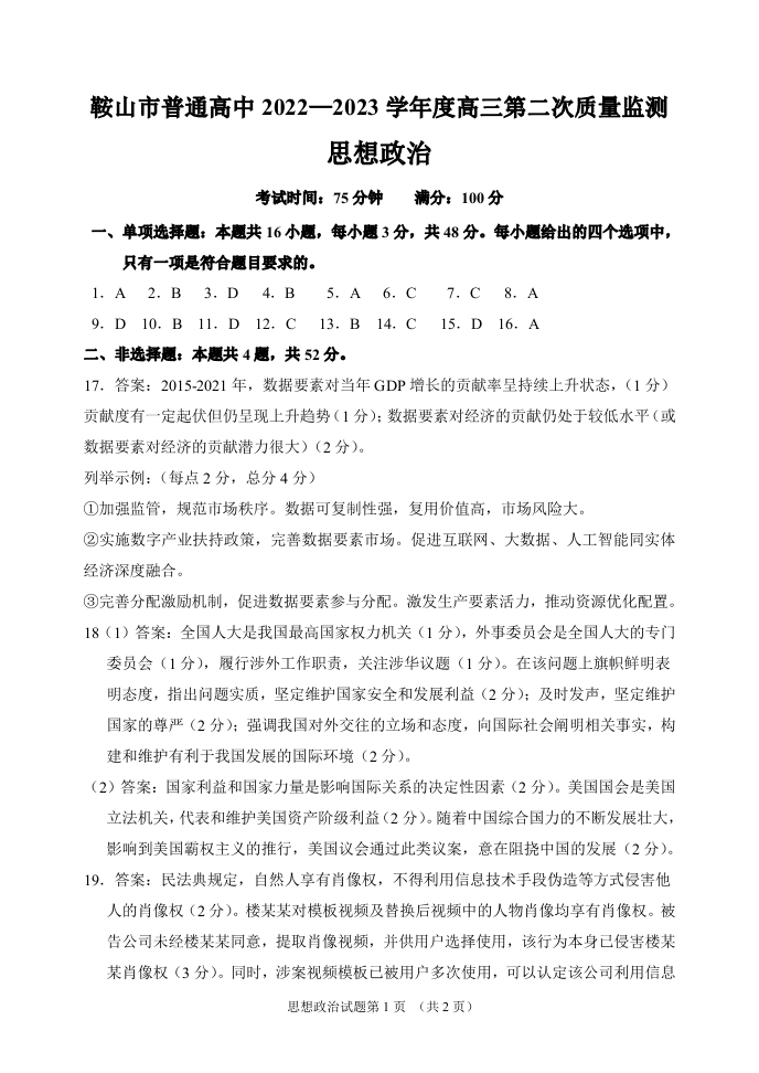 高三政治答案--辽宁省鞍山市普通高中高三第二次质量监测