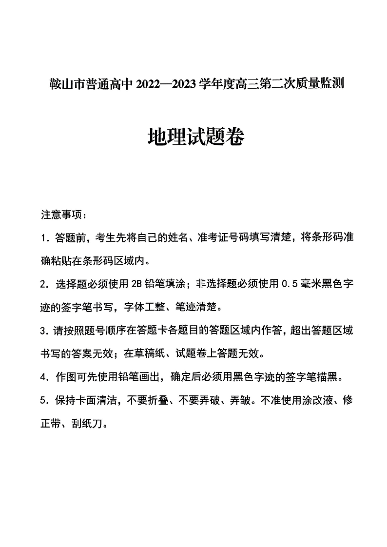 高三地理--辽宁省鞍山市普通高中高三第二次质量监测