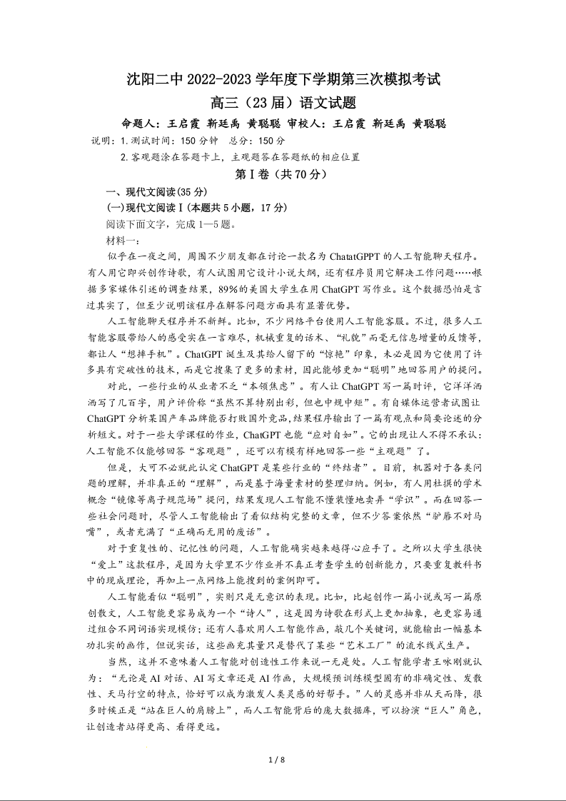 高三语文--辽宁省沈阳市第二中学2023高三第三次模拟考试