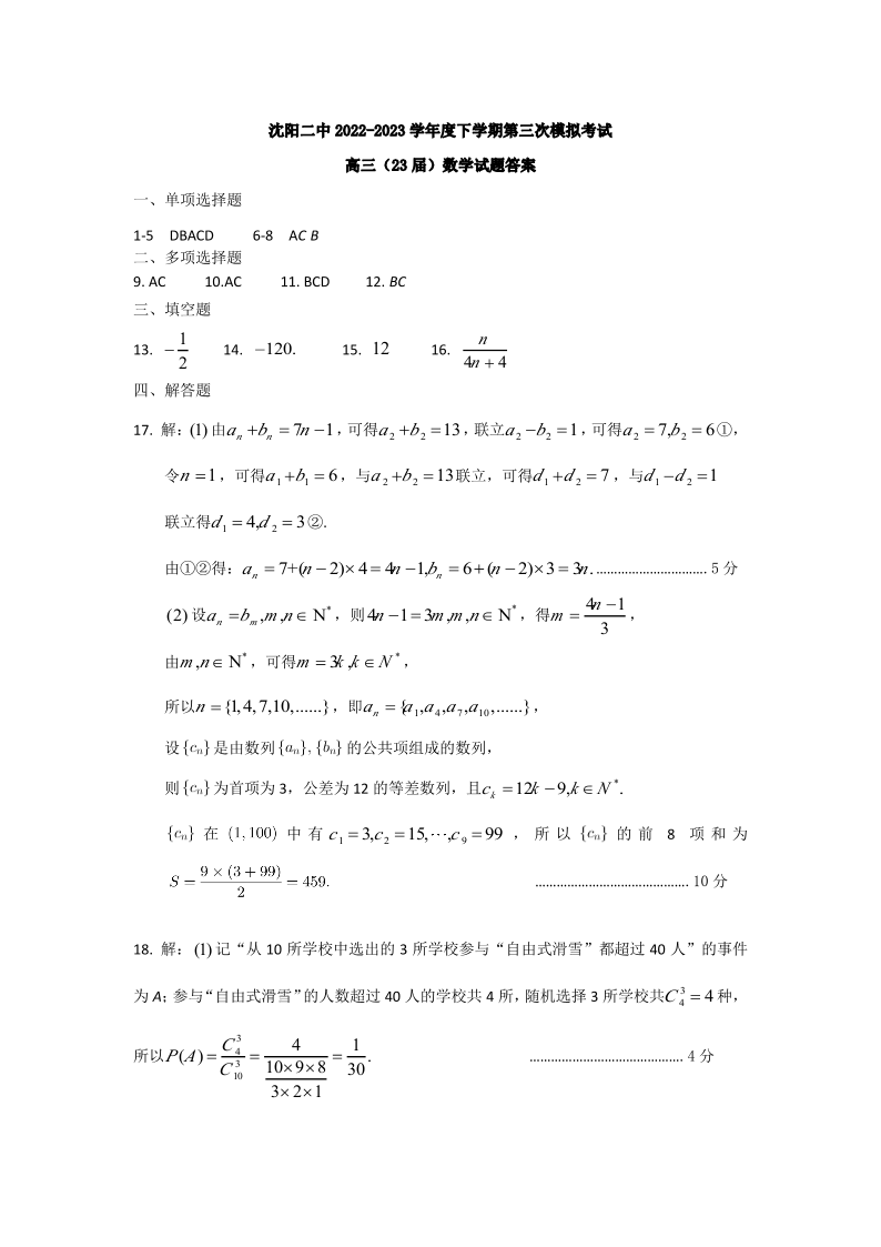 高三数学答案--辽宁省沈阳市第二中学2023高三第三次模拟考试