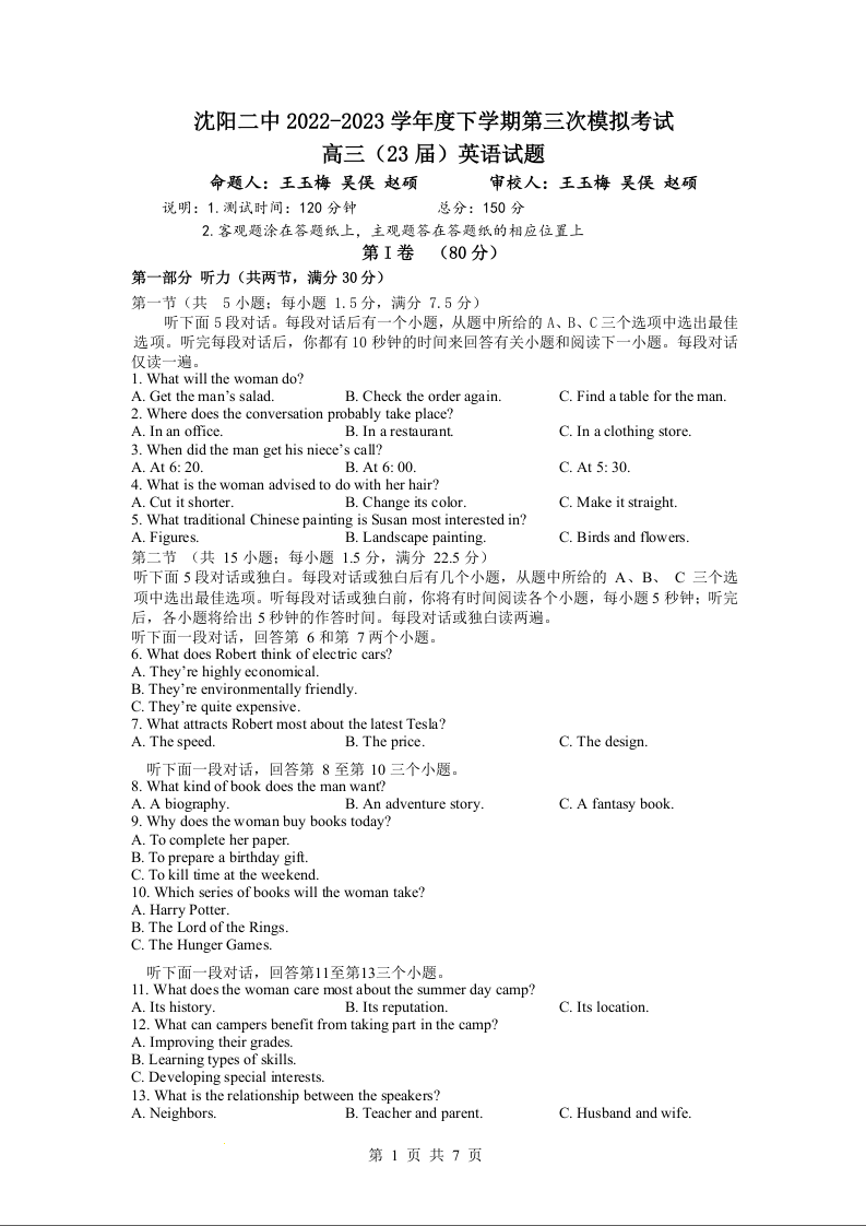 高三英语--辽宁省沈阳市第二中学2023高三第三次模拟考试