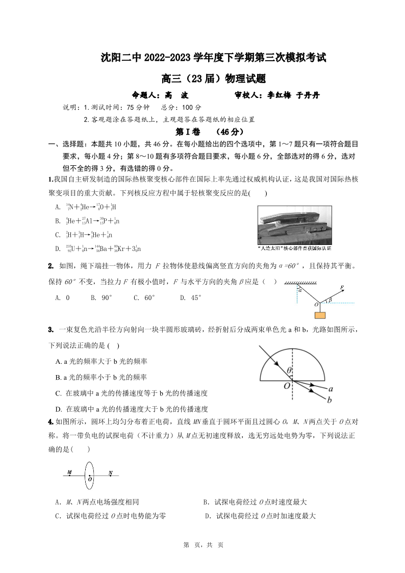 高三物理--辽宁省沈阳市第二中学2023高三第三次模拟考试
