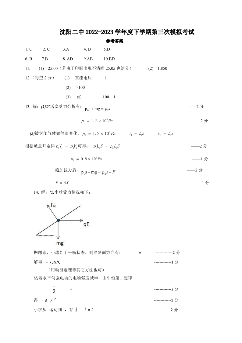 高三物理答案--辽宁省沈阳市第二中学2023高三第三次模拟考试