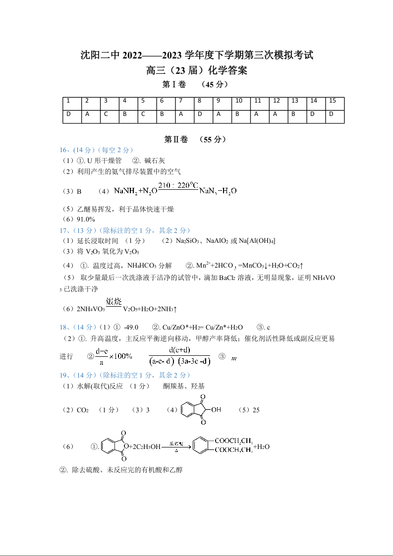 高三化学答案--辽宁省沈阳市第二中学2023高三第三次模拟考试