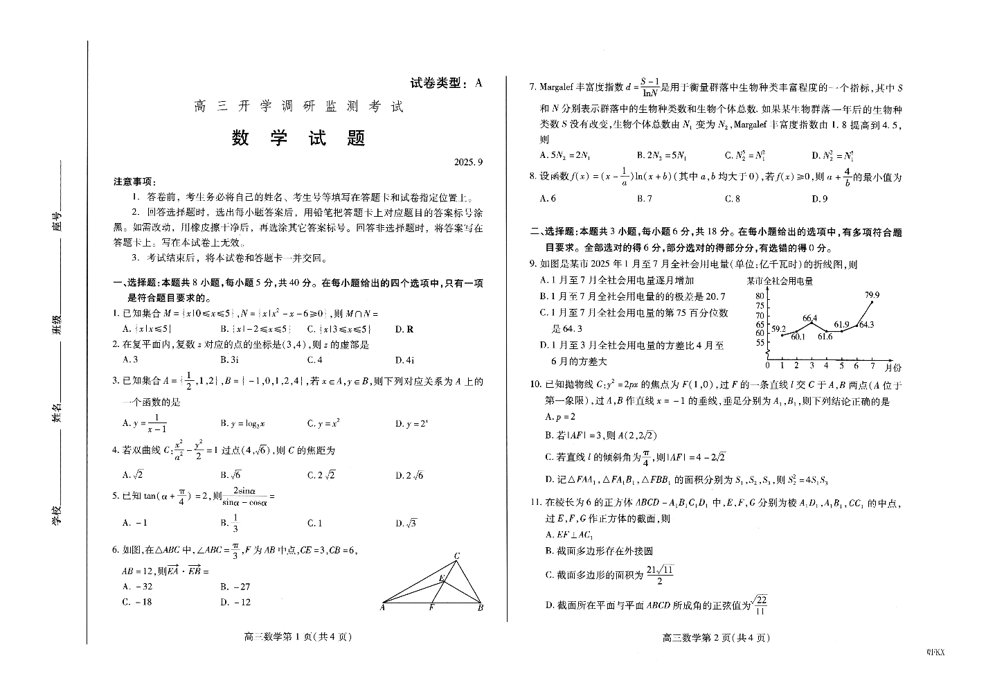 高三数学--山东省潍坊市2025.9高三开学调研监测考试